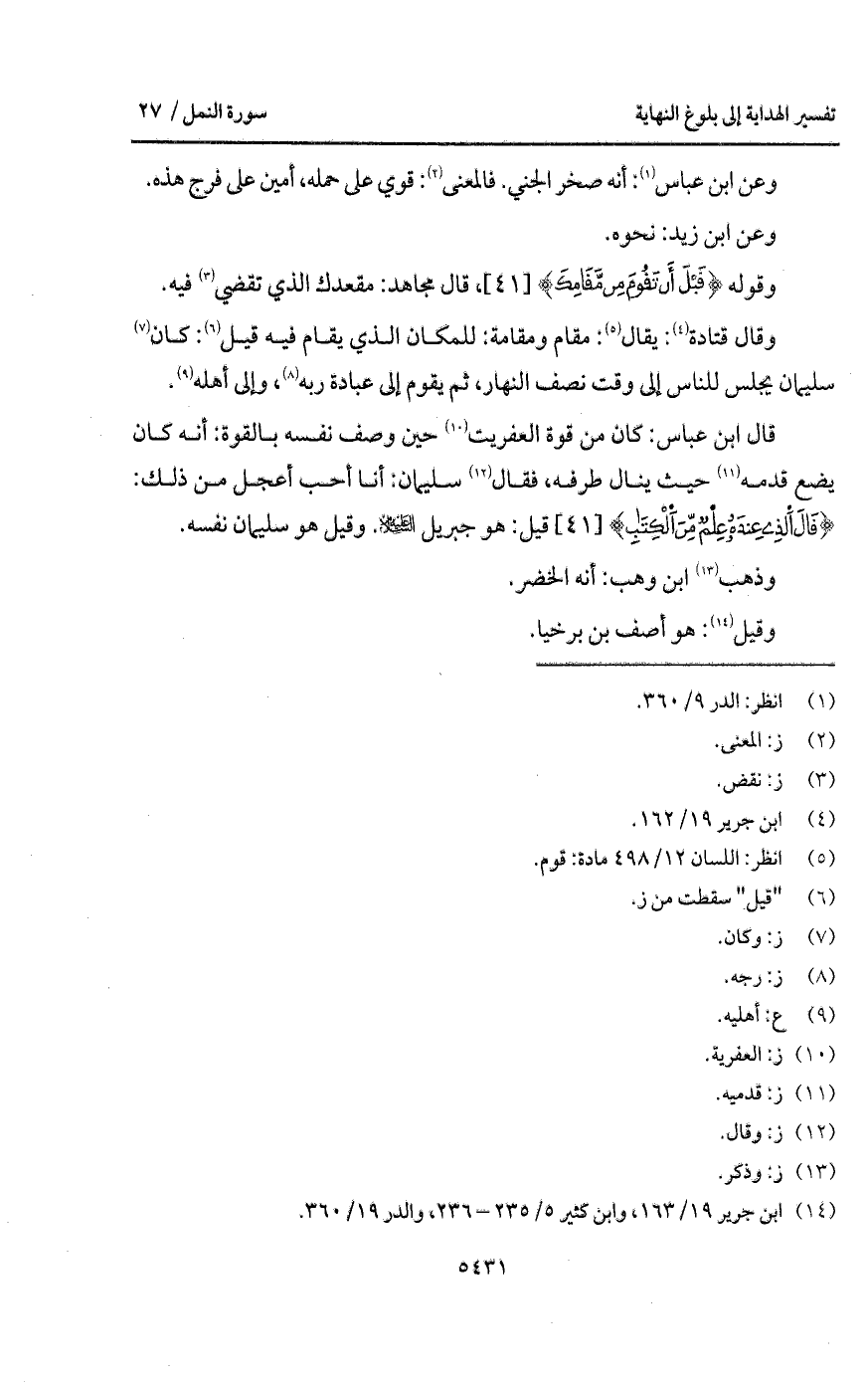 قال ابن عباس: كان من قوة العفريت حين وصف نفسه بالقوة: أنه كان يضع قدمه حيث ينال طرفه، فقال سليمان: أنا أحب أعجل من ذلك: {قَالَ الذي عِندَهُ عِلْمٌ مِّنَ الكتاب} قيل: هو جبريل عليه السلام. وقيل هو سليمان نفسه.