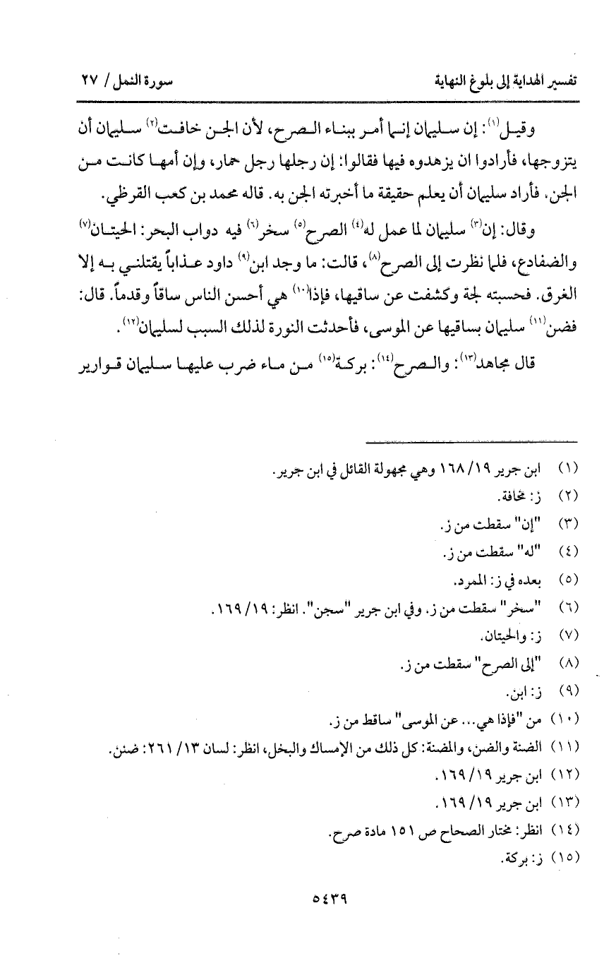 وقال: إن سليمان لما عمل له الصرح سخر فيه دواب البحر: الحيتان والضفادع، فلما نظرت إلى الصرح، قالت: ما وجد ابن داود عذاباً يقتلني به إلا الغرق. فحسبته لجة وكشفت عن ساقيها، فإذا هي أحسن الناس ساقاً وقدماً. قال: فضن سليمان بساقيها عن الموسى، فأحدثت النورة لذلك السبب لسيلمان.