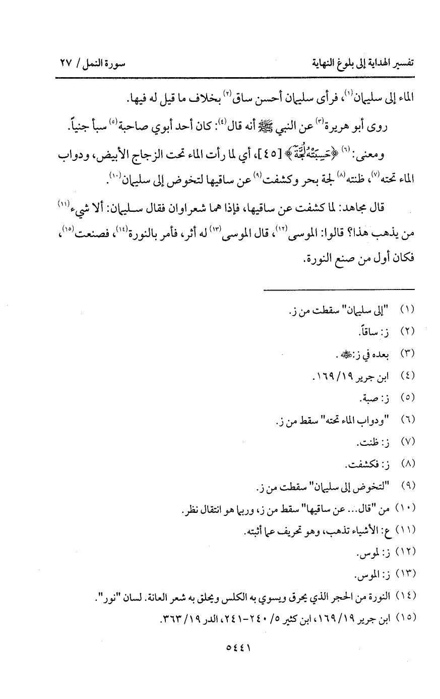 ومعنى: {حَسِبَتْهُ لُجَّةً}، أي لما رأت الماء تحت الزجاج الأبيض، ودواب الماء تحته، ظنته لجة بحر وكشفت عن ساقيها لتخوض إلى سليمان.