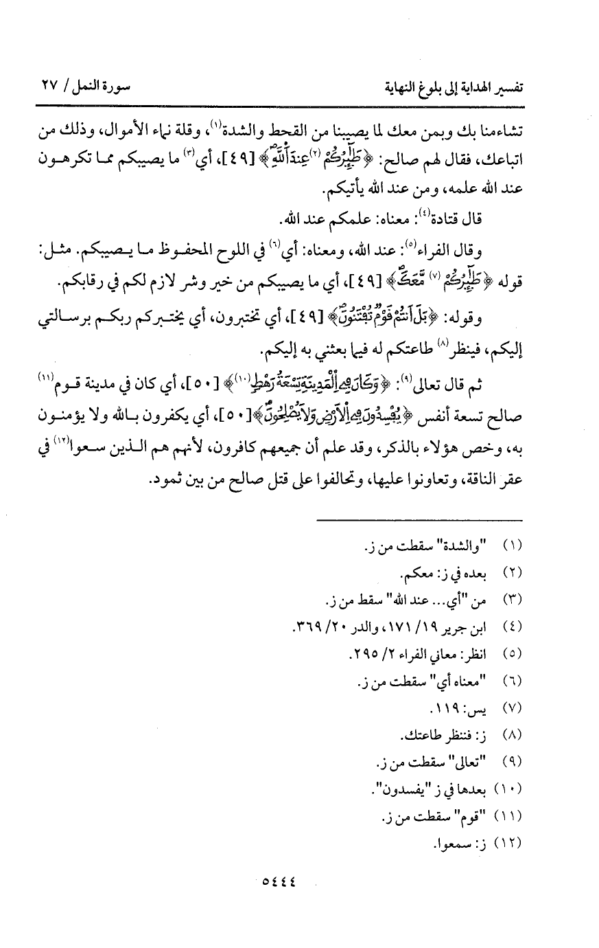 تشاءمنا بك وبمن معك لما يصيبنا من القحط والشدة، وقلة نماء الأموال، وذلك من اتباعك، فقال لهم صالح: {طَائِرُكُمْ عِندَ الله}، أي ما يصيبكم مما تكرهون عند الله علمه، ومن عند الله يأتيكم.