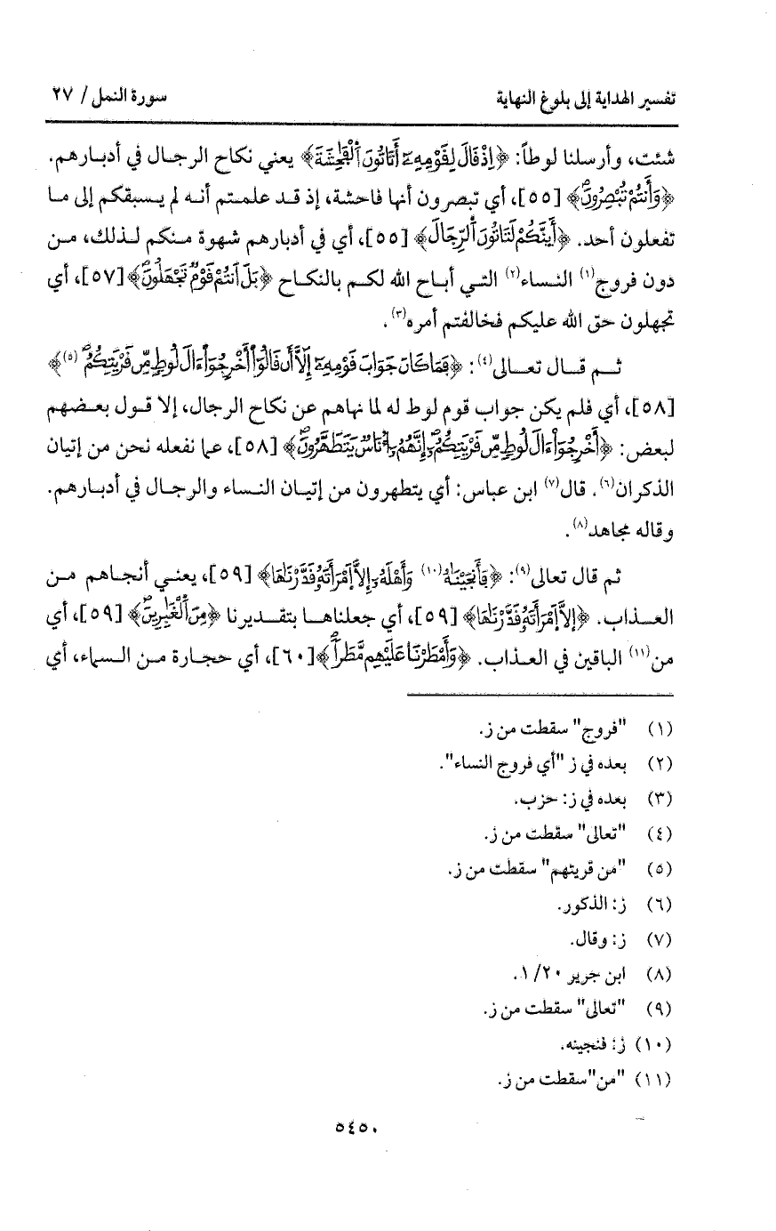 شئت، وأرسلنا لوطاً: {إِذْ قَالَ لِقَوْمِهِ أَتَأْتُونَ الفاحشة} يعني نكاح الرجال في أدبارهم. {وَأَنتُمْ تُبْصِرُونَ}، أي تبصرون أنها فاحشة، إذ قد علمتم أنه لم يسبقكم إلى من تفعلون أحد. {أَإِنَّكُمْ لَتَأْتُونَ الرجال}، أي في أدبارهم شهوة منكم لذلك، من دون فروج النساء التي أباح الله لكم بالنكاج {بَلْ أَنتُمْ قَوْمٌ تَجْهَلُونَ}، أي تجهلون حق الله عليكم فخالفتم أمره.