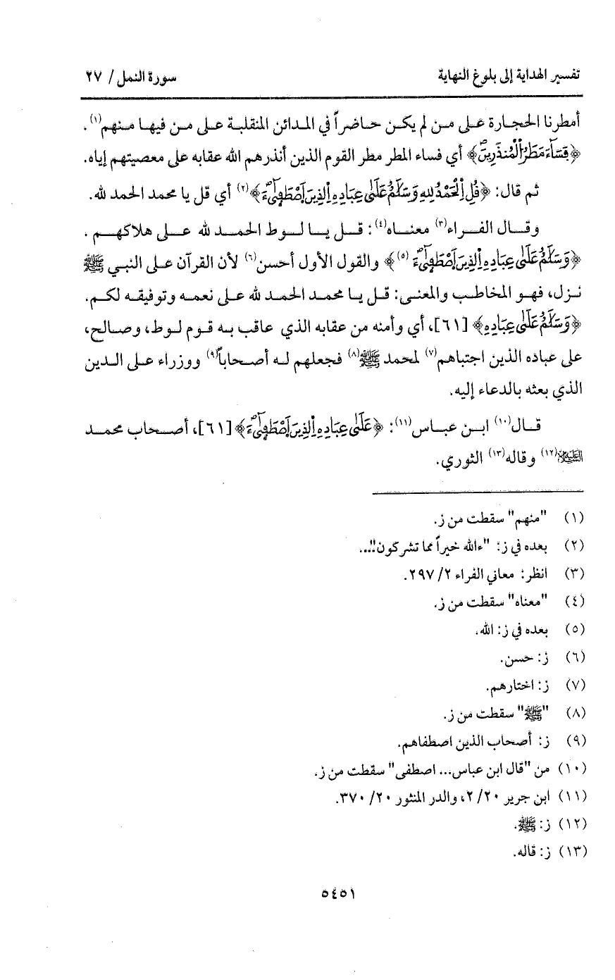 وقال الفراء معناه: قل يا لوط الحمد لله على هلاكهم. {وَسَلاَمٌ على عِبَادِهِ الذين اصطفى} والقول الأول أحسن لأن القرآن على النبي A نزل، فهو المخاطب والمعنى: قل يا محمد لله على نعمه وتوفيقه لكم. {وَسَلاَمٌ على عِبَادِهِ}، أي وأمنه من عقابه الذي عاقب به قوم لوط، وصالح، على عباده الذين اجتباهم لمحمد A فجعلهم له أصحاباً ووزراء على الذين الذي بثه بالدعاء إليه.