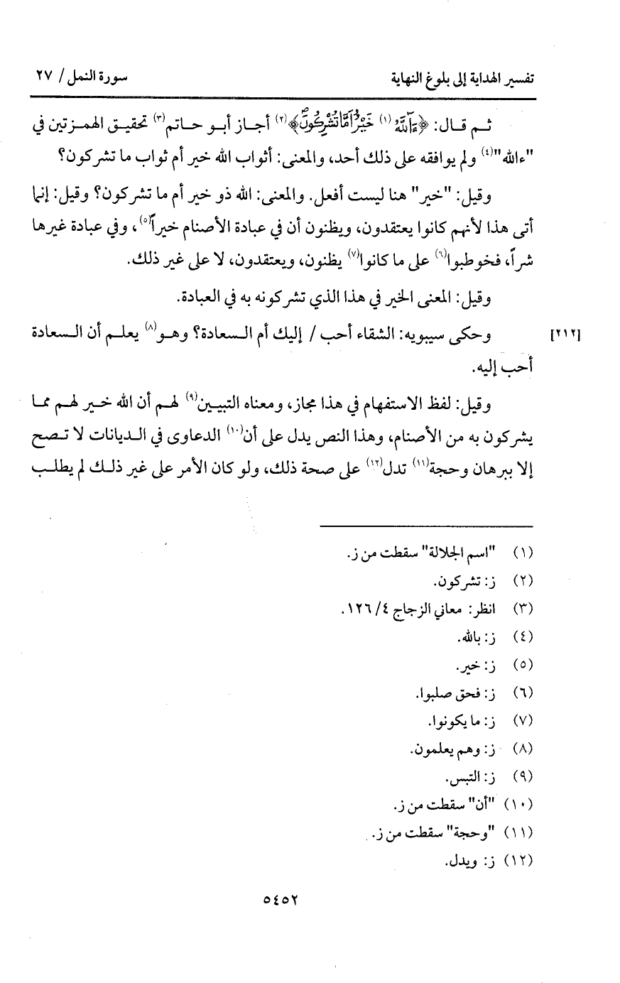 ثم قال: {ءَآللَّهُ خَيْرٌ أَمَّا يُشْرِكُونَ} أجاز أبو حاتم تحقيق الهمزتين في " ءالله " ولم يوافقه على ذلك أحد، والمعنى: أثواب الله خير أم ثواب ما تشركون؟