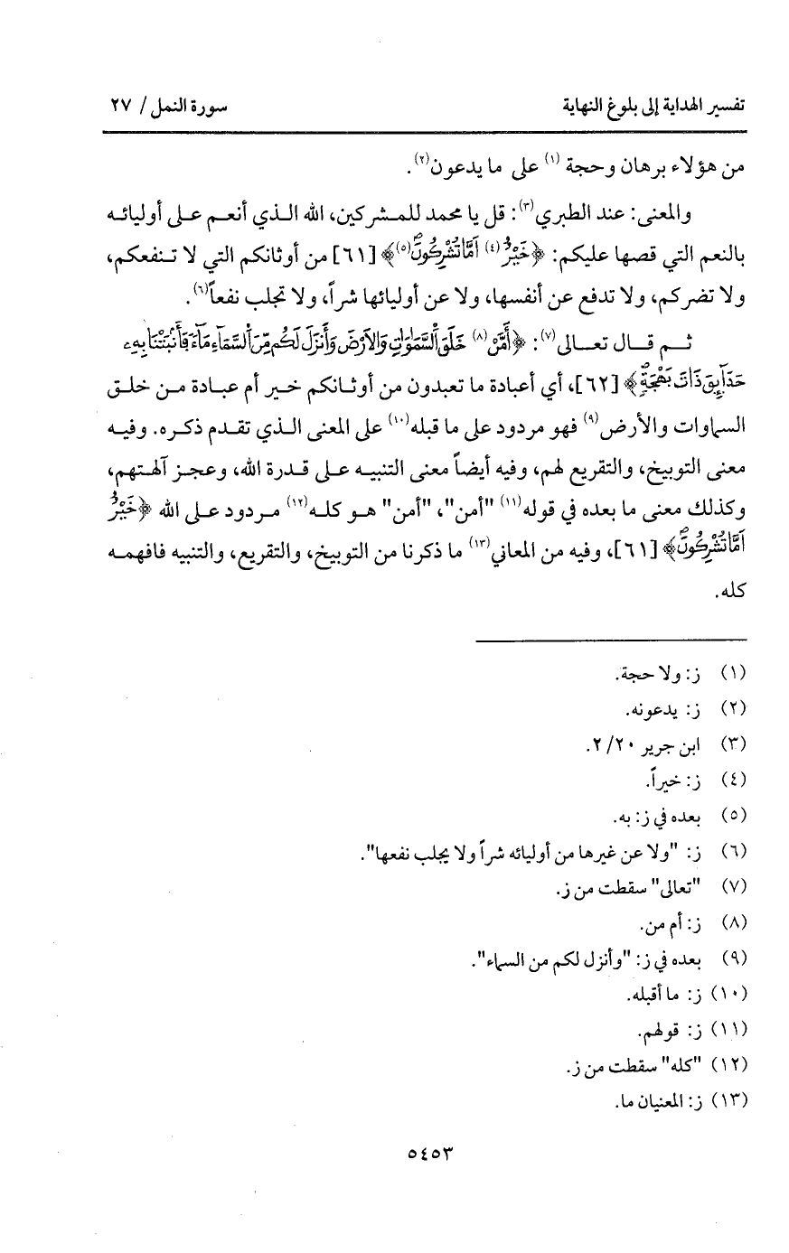 قال تعالى: {أَمَّنْ خَلَقَ السماوات والأرض وَأَنزَلَ لَكُمْ مِّنَ السمآء مَآءً فَأَنبَتْنَا بِهِ حَدَآئِقَ ذَاتَ بَهْجَةٍ}، أي أعبادة ما تعبدون من أوثانكم خير أم عبادة من خلق السماوات والأرض فهو مردود على ما قبله على المعنى الذي تقدم ذكره. وفيه معنى التوبيخ، والتقريع لهم، وفيه أيضاً معنى التنبيه على قدرة الله، وعجز آلهتهم، وكذلك معنى ما بعده في قوله " أمن "، " أمن " هو كله مردود على الله {خَيْرٌ أَمَّا يُشْرِكُونَ} [النمل: 59]، وفيه من المعاني ما ذكرنا من التوبيخ، والتقريع، والتنبيه فافهمه كله.