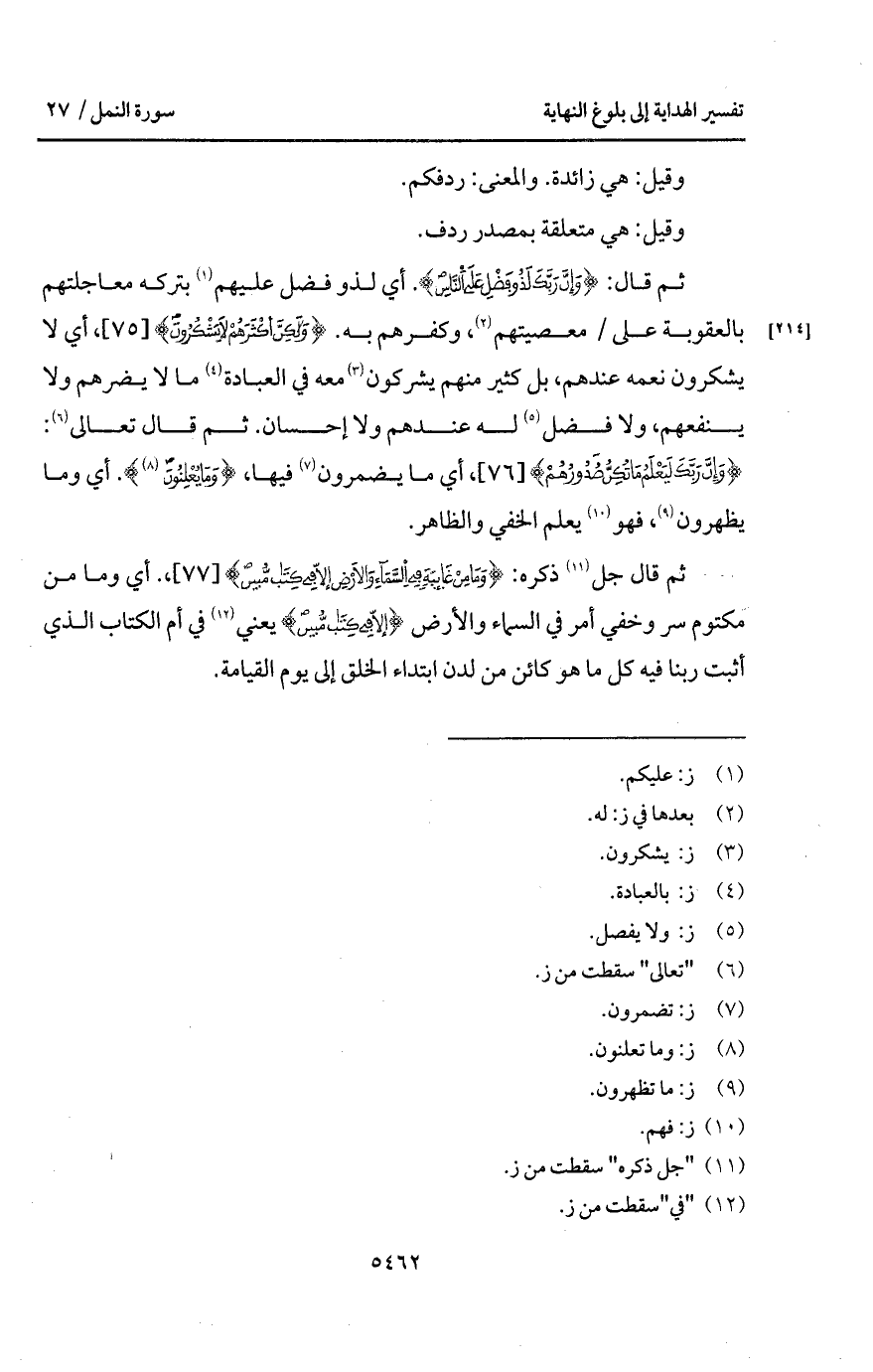 ثم قال: {وَإِنَّ رَبَّكَ لَذُو فَضْلٍ عَلَى الناس}. أي لذو فضل عليهم بتركه معاجلتهم بالعقوبة على / معصيتهم، وكفرهم به. {ولكن أَكْثَرَهُمْ لاَ يَشْكُرُونَ}، أي لا يشكرون نعمه عندهم، بل كثير منهم يشركون معه في العبادة ما لا يضرهم ولا ينفعهم، ولا فضل له عندهم ولا إحسان. ثم قال تعالى: {وَإِنَّ رَبَّكَ لَيَعْلَمُ مَا تُكِنُّ صُدُورُهُمْ}، أي ما يضمرون فيها، {وَمَا يُعْلِنُونَ}. أي وما يظهرون، فهو يعلم الخفي والظاهر.