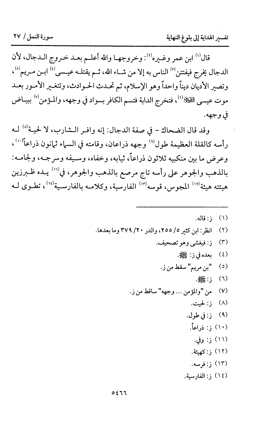 وقد قال الضحاك - في صفة الدجال: إنه وافر الشارب، لا لحية له رأسه كالقلة العظيمة طول وجهه ذراعان، وقامته في السماء ثمانون ذراعاً، وعرض ما بين منكبيه ثلاثون ذراعاً، ثيابه، وخفاه، وسيفه وسرجه، ولجامه: بالذهب والجوهر على رأسه تاج مرصع بالذهب والجوهر، في يده طبرزين هيئته هيئة المجوس، قوسه الفارسية، وكلامه بالفارسية، تطوى له