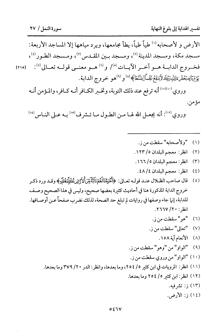 الأرض ولأصحابه طياً طياً، يطأ مجامعها، ويرد مياهها إلا المساجد الأربعة: مسجد مكة، ومسجد المدينة، ومسجد بين المقدس، ومسجد الطور، فخروج الدابة هو آخر الآيات / وهو معنى قوله تعالى: {يَوْمَ يَأْتِي بَعْضُءَايَاتِ رَبِّكَ لاَ يَنفَعُ نَفْساً إِيمَانُهَا} [الأنعام: 158] وهو خروج الدابة.