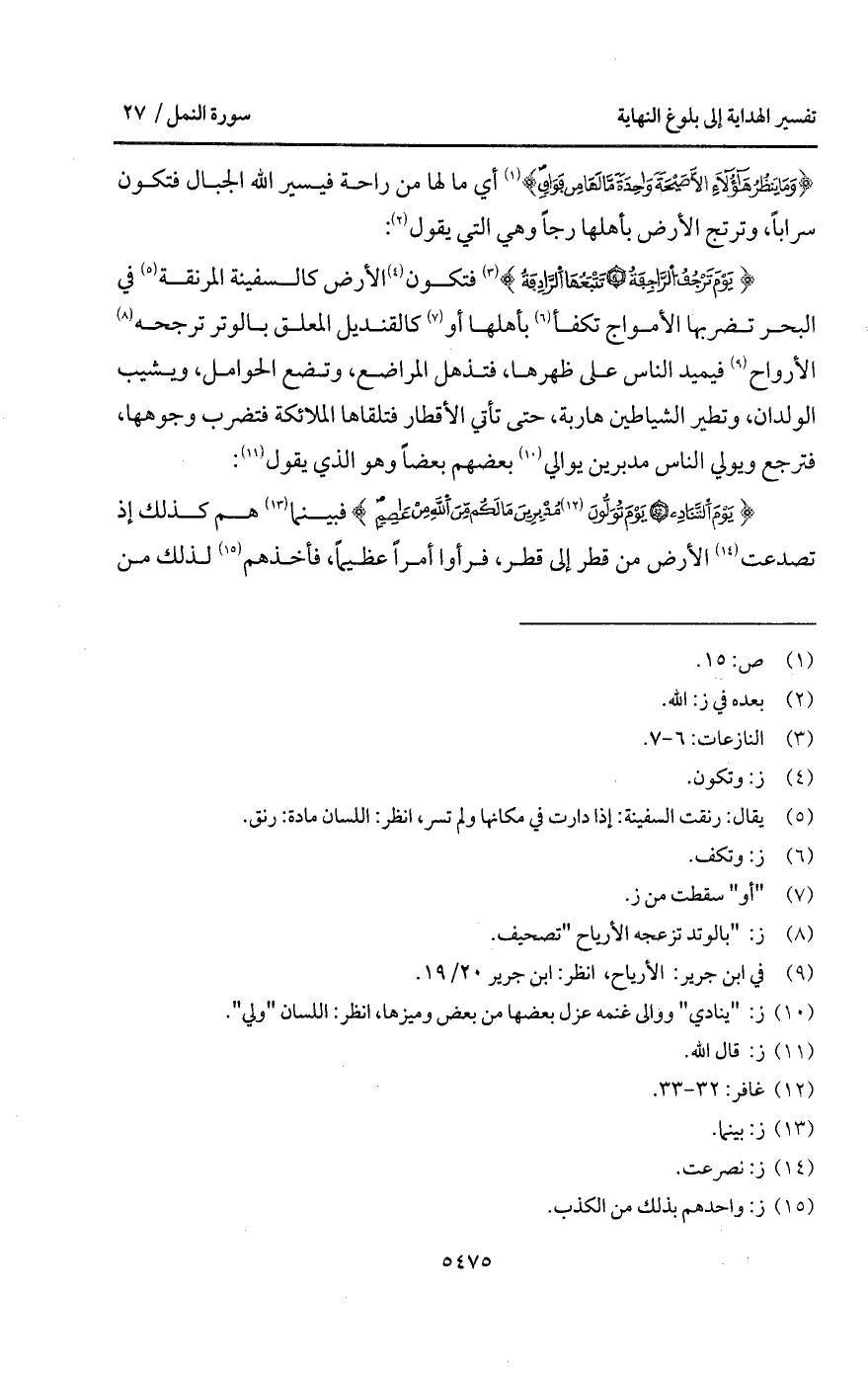 {يَوْمَ تَرْجُفُ الراجفة * تَتْبَعُهَا الرادفة} فتكون الأرض كالسفينة المرنقة في البحر تضربها الأمواج تكفأ بأهلها أو كالقنديل المعلق بالوتر ترجحه الأمواج فيميد الناس على ظهرها، فتذهل المراضع، وتضع الحوامل، ويشيب الولدان، وتطير الشياطين هاربة، حتى تأتي الأقطار فتلقاها الملائكة فتضرب وجوهها، فترجع ويولي الناس مدبرين يوالي بعضهم بعضاً وهو الذي يقول: