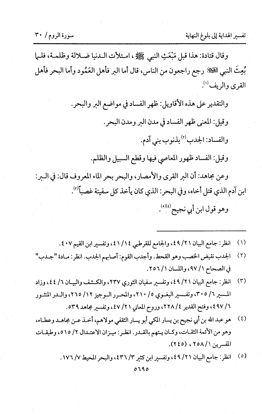 وقال قتادة: هذا قبل مَبْعَثِ النبي A، امتلأت الدنيا ضلالة والظلمة، فلما بُعِثَ النبي عليه السلام رجع راجعون من الناس، قال أما البر فأهل العَمُود وأما البحر فأهل القرى والريف.
