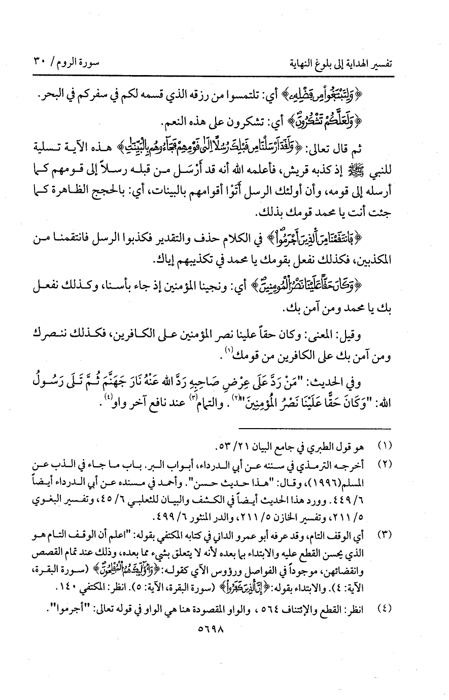 وفي الحديث: " مَنْ رَدَّ عَلَى عِرْضِ صَاحِبِهِ رَدَّ الله عَنْهُ نَارَ جَهَنَّمَ ثُمَّ تَلَى رَسُولُ الله: " وَكَانَ حَقًّا عَلَيْنَا نَصْرُ الْمُؤمِنِينَ " والتمام عند نافع آخر واو.