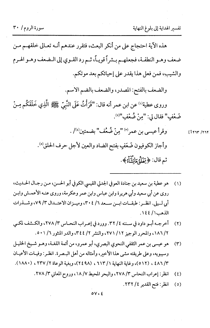 وروى عطية عن ابن عمر أنه قال: " قَرَأْتُ عَلَى النَّبِيّ A الَّذي خَلَقَكُم مِنْ ضَعْفٍ " فقال لي: " مِنْ ضُعْفٍ ".