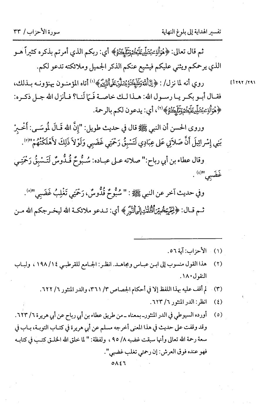 وقال عطاء بن أبي رباح: " صلاته على عباده: سُبُّوحٌ قُدُّوسٌ لَتَسْبِقُ رَحْمَتِي غَضَبِ ".
