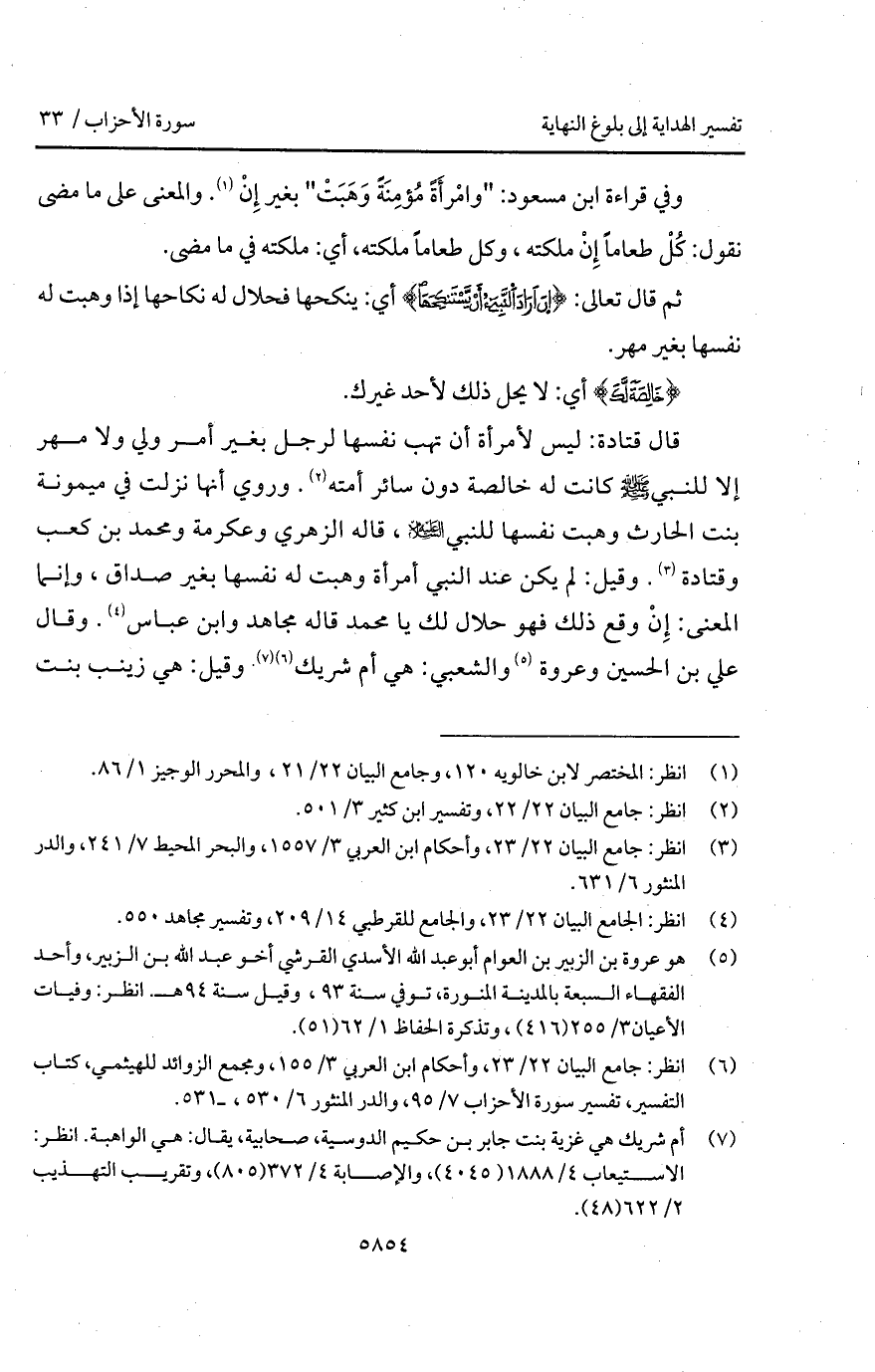 قال قتادة: ليس لأمرأة أن تهب نفسها لرجل بغير أمر ولي ولا مهر إلا للنبي A كانت له خاصلة دون سائر أمته. وروي أنها نزلت في ميمونة بن الحارث وهبت نفسها للنبي عليه السلام، قاله الزهري وعكرمة ومحمد بن كعب وقتادة. وقيل: لم يكن عند النبي أمرأة وهب له نفسها بغير صداق، وإنما المعنى: إِنْ وقع ذلك فهو حلال لك يا محمد قاله مجاهد وابن عباس. وقال علي بن الحسين وعروة والشعبي: هي أم شريك وقيل: هي زينب بنت