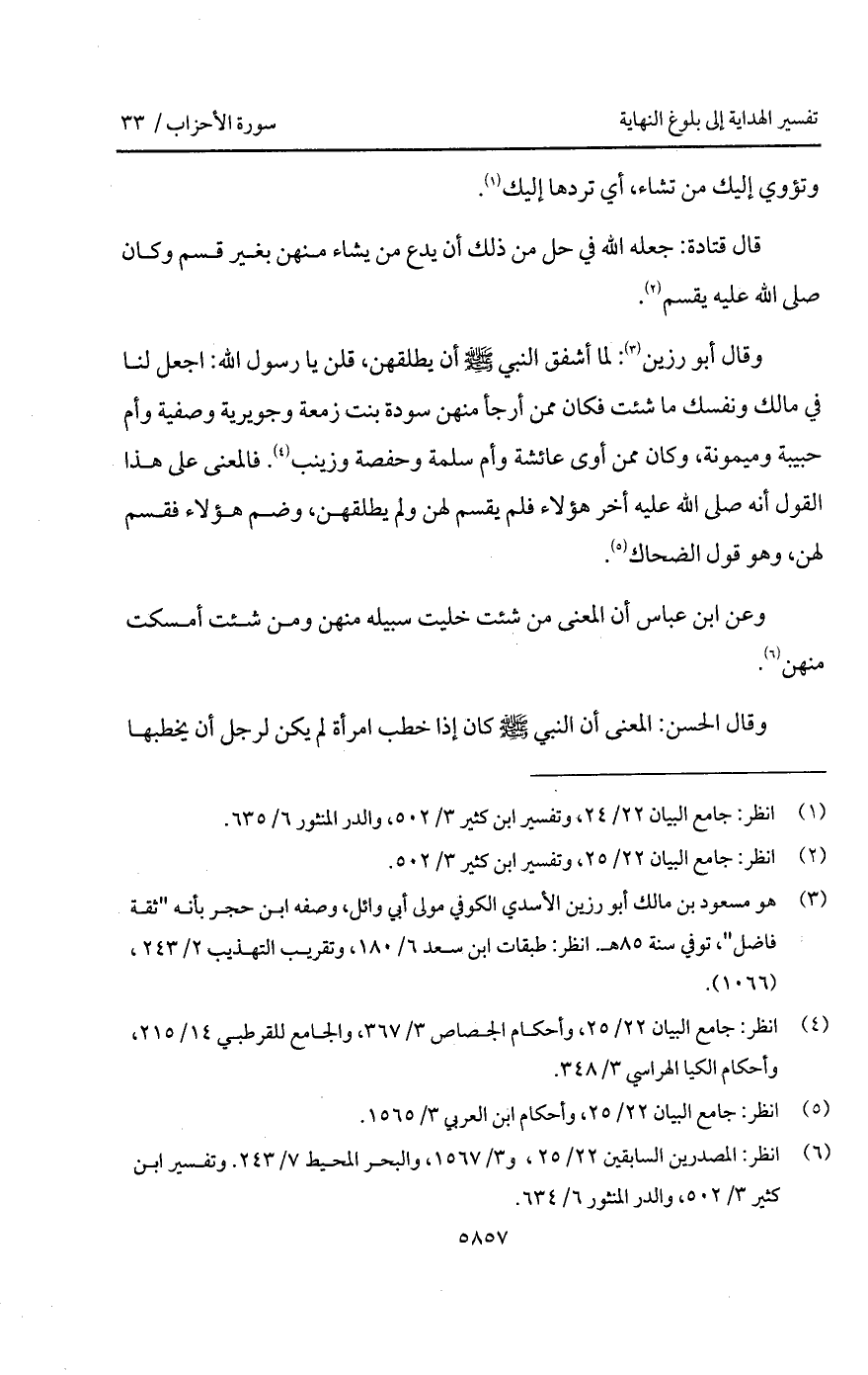 وقال أبو رزين: لما أشفق النبي A أن يطلقهن، قلن يا رسول الله: اجعل لنا في مالك ونفسك ما شئت فكان ممن أرجأ منهم سودة بنت زمعة وجويرية وصفية وأم حبيبة وميمونة، وكان ممن أوى عائشة وأم سلمة وحفصة زينب. فالمعنى على هذا القول أنه صلى الله عليه أخر هؤلاء فلم يقسم لهن ولم يطلقهن، وضم هؤلاء فقسم لهن، وهو قول الضحاك.