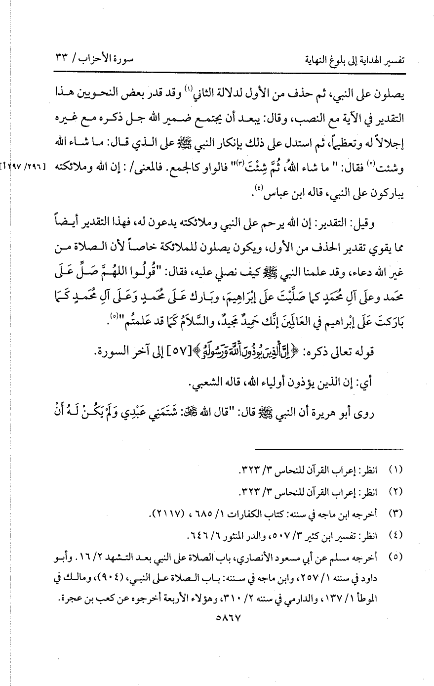 يصلون على النبي، ثم حذف من الأول لدلالة الثاني وقد قرد بعض النحويين هذا التقدير في الآية مع النصب، وقال: يبعد أن يجتمع ضمير الله جل ذكره مع غيره إجلالاً له وتعظيماً، ثم استدل على ذلك بإنكار النبي A على الذي قال: ما شاء الله وشئت فقال: " ما شاء اللهُ، ثُمَّ شِئْتَ " فالواو كالجمع. فالمعنى/: إن الله وملائكته يباركون على النبي، قاله ابن عباس.