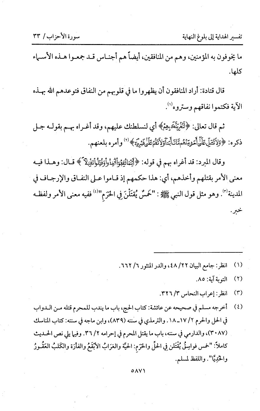 وقال المبرد: قد أغراه بهم في قوله: {أَيْنَمَا ثقفوا أُخِذُواْ وَقُتِّلُواْ تَقْتِيلاً} قال: وهذا فيه معنى الأمر بقتلهم وأخذهم، أي: هذا حكمهم إذ قاما على النفاق والإرجاف في المدينة. وهو مثل قول النبي A: " خَمسٌ يُقتَلْنَ فِي الحَرَمِ " ففيه معنى الأمر ولفظه خبر.