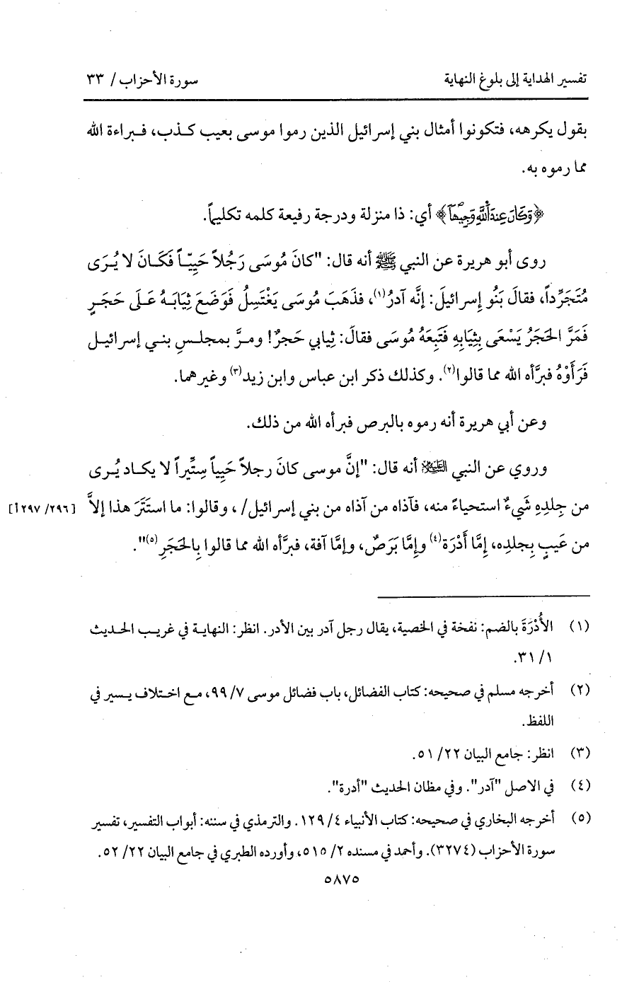 وروي عن البي عليه السلام أنه قال: " إنَّ موسى كانَ رجلاً حَيِياً سِتِّيراً لا يكاد يُرى من جِلدِهِ شَيءٌ استحياءً منه، فآذاه من آذاه من بني إسرائيل/، وقالوا: ما استَتَرَ هذا إلاَّ من عَيبٍ بِجلدِهِ، إِمَّا أَدْرَة وإِمَّا بَرَصٌ، وإمَّا آفة، فبرَّأه الله مما قالوا بِالحَجَرِ ".