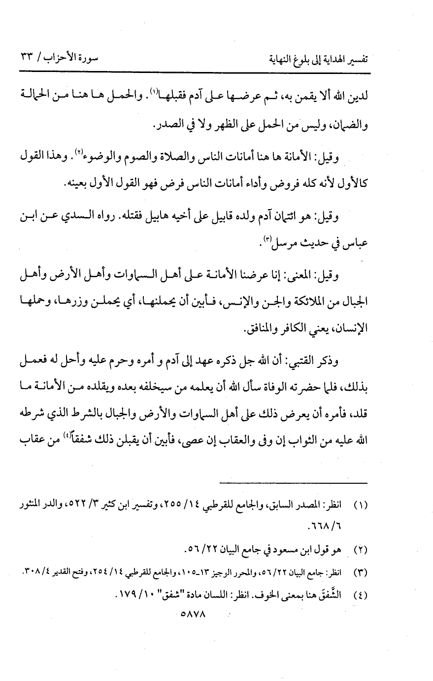 وذكر القتبي: أن الله جل ذكره عهد إلى آدم وأمره حرم عليه وأحل له فعمل بذلك، فلما حضرته الوفاة سأل الله أن يعلمه من سيخلفه بعده ويقلده من الأمانة ما قلد، فأمره أن يعرض ذلك على السماوات والأرض والجبال بالشرط الذي شرطه الله عليه من الثواب إن وفى والعقاب إن عصى، فأبين أن يقبلن ذلك شفقاً من عقاب