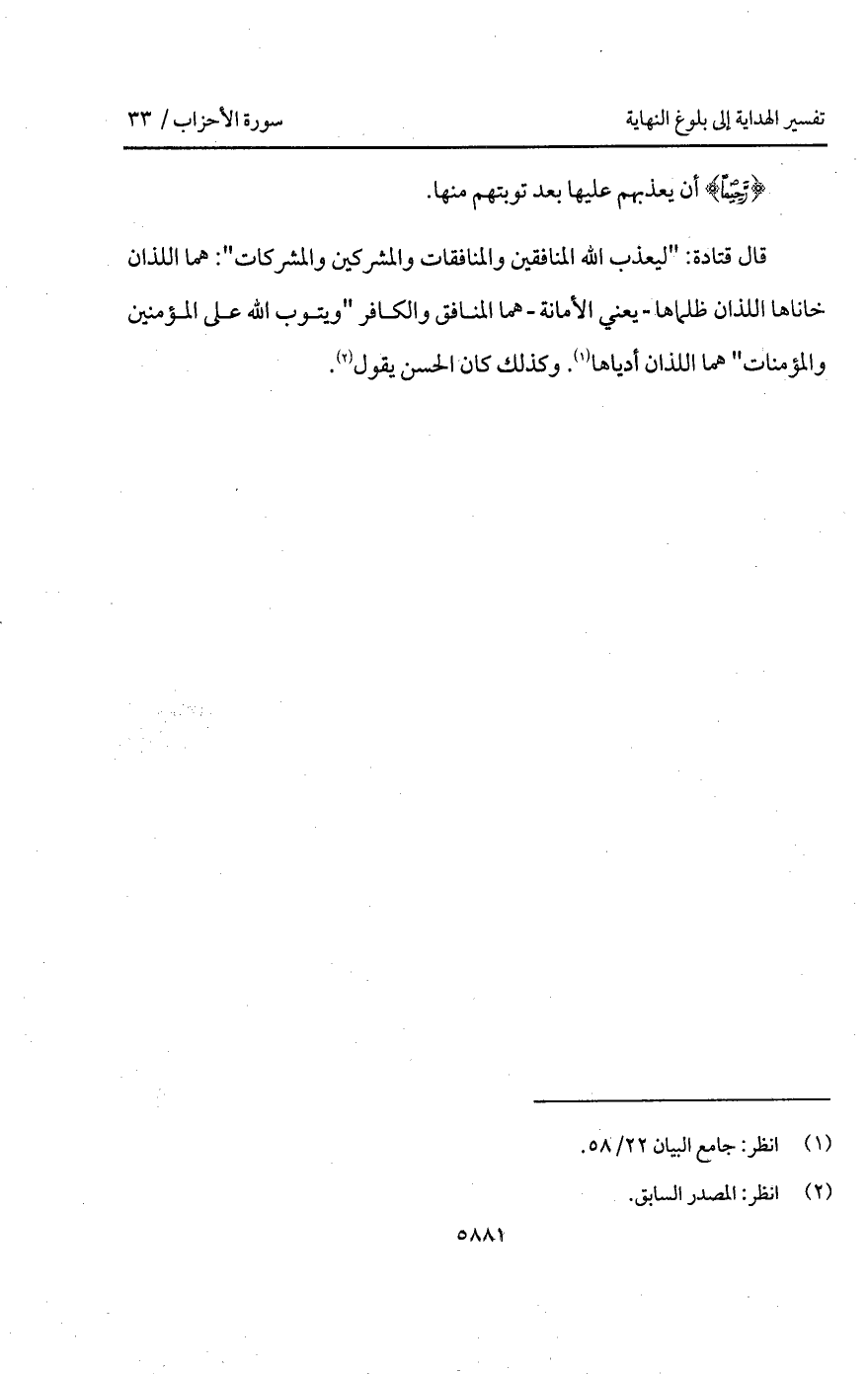 قال قتادة: " ليعذب الله المنافقين والمنافقات والمشركين والمشركات ": هما اللذان خاناها اللذان ظلماها - يعني الأمانة - هما المنافق والكافر " ويتوب الله على المؤمنين والمؤمنات " هما اللذان أدياها. وكذلك كان الحسن يقول.