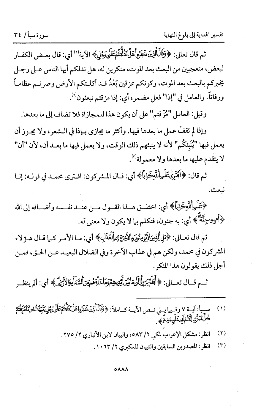 ثم قال تعالى: {وَقَالَ الذين كَفَرُواْ هَلْ نَدُلُّكُمْ على رَجُلٍ} الآية أي: قال بعض الكفار لبعض، متعجبين من البعث بعد الموت، منكرين له، هل ندلكم أيها الناس على رجل يخبركم بالبعث بعد الموت، وكونكم ممزقين بَعْدُ قد أكلتكم الأرض وصرتم عظاماً ورفاتاً. والعامل في " إذا " فعل مضمر، أي: إذا مزقتم تبعثون.