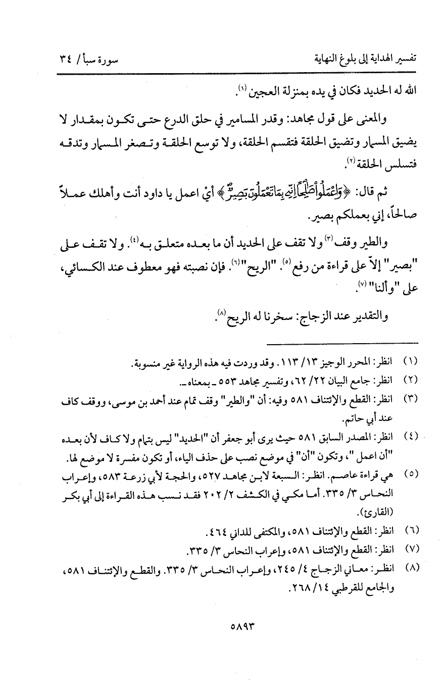 والطير وقف ولا تقف على الحديد أن مابعده متعلق به. ولا تقف على " بصير " إلاّ على قراءة من رفع. " الريح ". فإن نصبته فهو معطوف عند الكسائي، على " وألنا ".