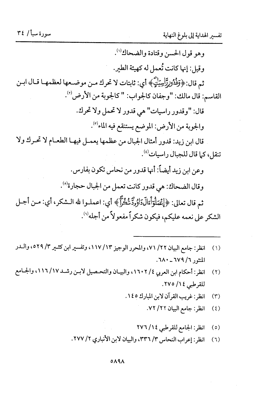 ثم قال: {وَقُدُورٍ رَّاسِيَاتٍ} أي: ثابتات لا تحرك من موضعها لعظمها قال ابن القاسم: قال مالك: " وجفان كالجواب: " كالجوبة من الأرض.