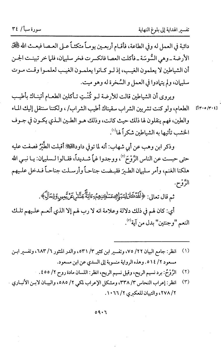دائبة في العمل له وفي الطاعة، فأقام أربعين يوماً متكئاً على العصا فبعث الله D الأرضة - وهي السُّوسَة - فأكلت العصا فانكسرت فخر سليمان، فلما خر تبينت الجن أن الشياطين لا يعلمون الغيب، إذ لو كانوا يعلمون الغيب لعلموا وقت موت سليمان، ولم يتمادوا في العمل والسُخرة له وهو ميت.