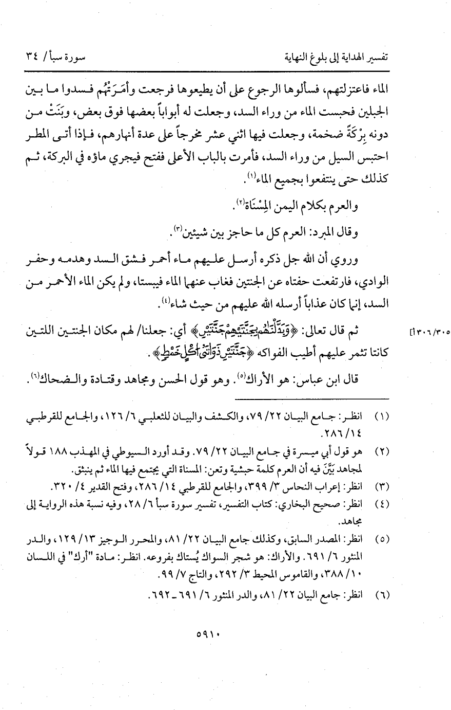 وروي أن الله جل ذكره أرسل عليهم ماء أحمر فشق السد وهدمه وحفر الوادي، فارتفعت حفتاه عن الجنتين فغاب عنهما الماء فيبستا، ولم يكن الماء الأحمر من السد، إنما كان عذاباً أرسله الله عليهم من حيث شياء.