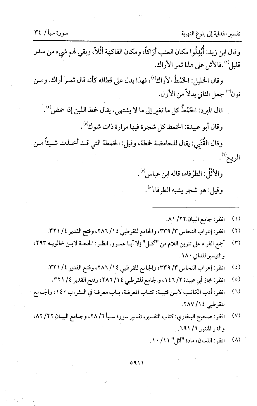 وقال الخليل: الخَمْطُ الأراك، فهذا يدل على قطافه كأنه قل ثم أراك. ومن نون جعل الثاني بدلاً من الأول.
