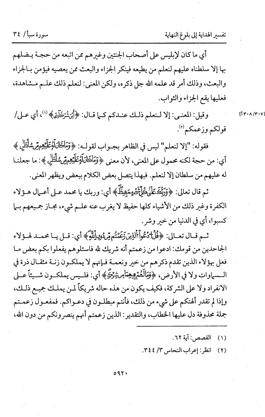 أي ما كان لإبليس على أصحاب الجنتين وغيرهم ممن اتبعه من حجة يضلهم بها إلا سلطناه عليهم لنعلم من يطيعه فينكر الجزاء والبعث ممن يعصيه فيؤمن بالجزاء البعث، وذلك أمر قد علمه الله جل ذكره، ولكن المعنى: لنعلم ذلك علم مشاهدة، فعليها يقع الجزاء والثواب.