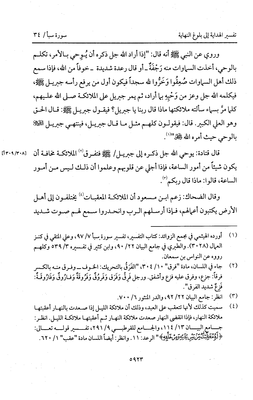 وروي عن النبي A أنه قال: " إذا أراد الله جل ذكره أن يُوِحي بالأمر، تكلم بالوحي، أخذت السماوات منه رَجْفَةٌ - أو قال رعدة شديدة - خوفاً من الله، فإذا سمع ذلك أهل السماوات صُعِقُوا وَخَرُّوا لله سجداً فيكون أول من يرفع رأسه جبريل A، فيكلمه الله جل وعز من وَحْيِهِ بما أراد، ثم يمر جبريل على الملائكة صلى الله عليهم، كلما مرَّ بسماء سألته ملائكتها ماذا قال ربنا جبريل؟ فيقول جبريل A: قال الحق وهي العلي الكبير. قال: فيقولون كلهم مثل ما قال جبريل، فينتهي جبريل عليه السلام بالوحي حيث أمره الله D ".