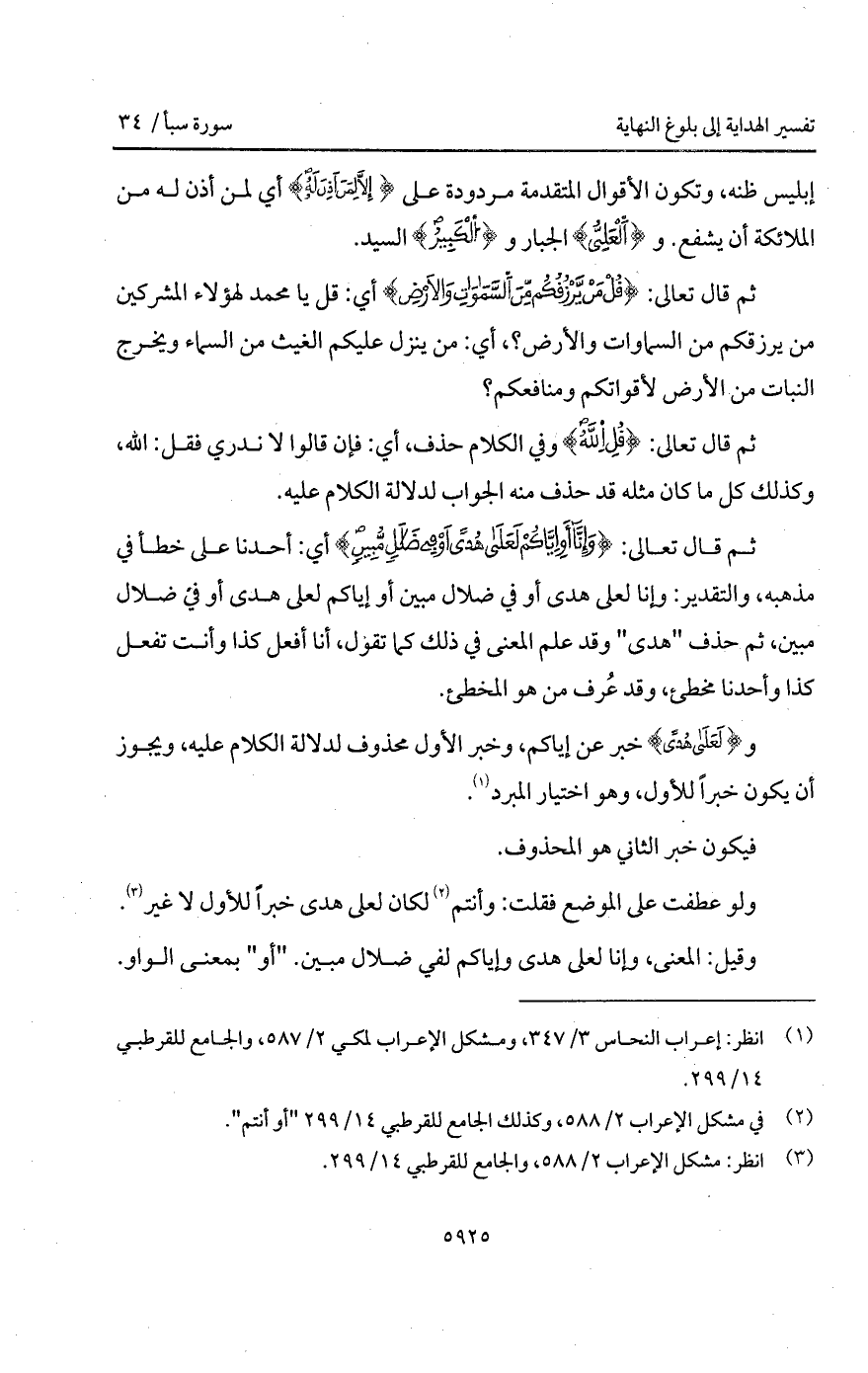 ثم قال تعالى: {وَإِنَّآ أَوْ إِيَّاكُمْ لعلى هُدًى أَوْ فِي ضَلاَلٍ مُّبِينٍ} أي: أحدنا على خطأ في مذهبه، والتقدير: وإنا لعلى هدى أو في ضلال مبين أو أياكم لعلى هدى أو في ضلال مبين، ثم حذف " هدى " وقد علم المعنى في ذلك كما تقول، أنا أفعل كذا وأنت تفعل كذا وأحدنا مخطىء، وقد عُرف من هو المخطئ.
