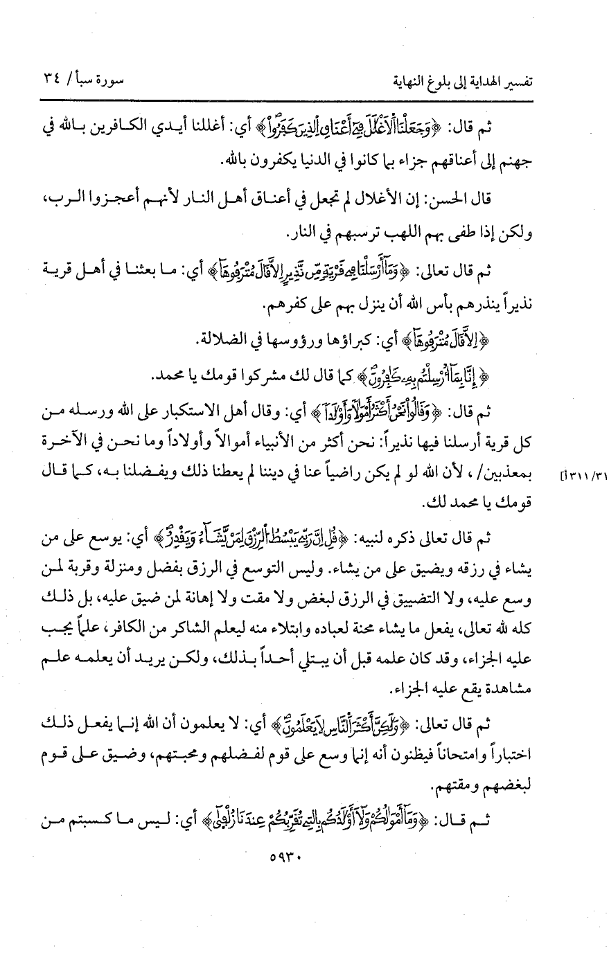 ثم قال: {وَقَالُواْ نَحْنُ أَكْثَرُ أَمْوَالاً وَأَوْلاَداً} أي: وقال أهل الاستكبار على الله ورسله من كل قرية أرسلنا فيها نذيراً: نحن أكثر من الأنبياء أموالاً وأولاداً وما نحن في الآخرة بمعذبين/، لأن الله لو لم يكن راضياً عنا في ديننا لم يعطنا ذلك ويفضلنا به، كما قال قومك يا محمد لك.