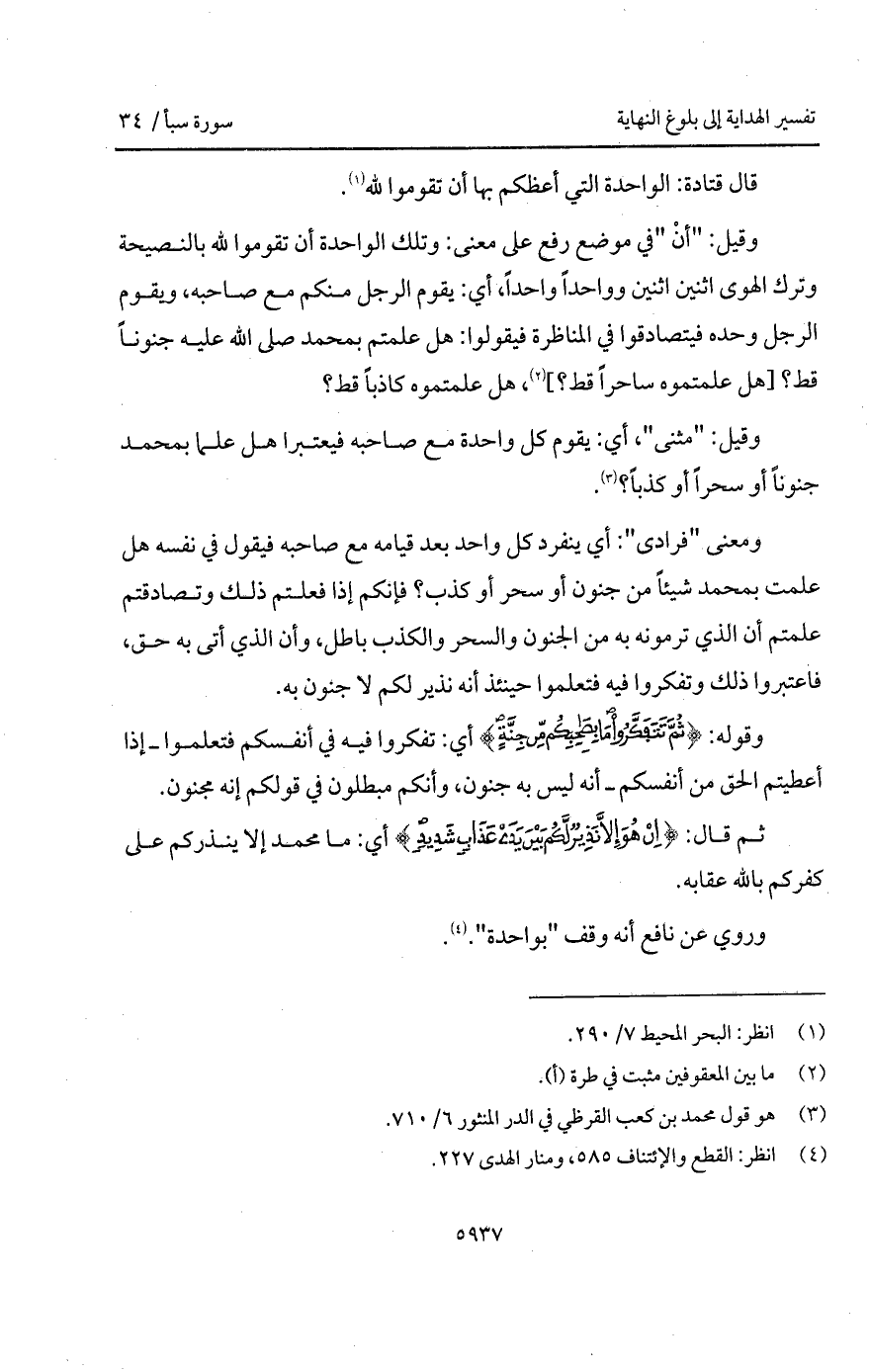 ومعنى " فرادى ": أي ينفرد كل واحد بعد قيامه مع صاحبه فيقول في نفسه هل علمت بمحمد شيئاً من جنون أو سحر أو كذب؟ فإنكم إذا فعلتم ذلك وتصادقتم علمتم أن الذي ترمونه به من الجنون والسحر والكذب باطل، وأن الذي أتى به حق، فاعتبروا ذلك وتفكروا فيه فتعلموا حينئذ أنه نذير لكم لا جنون به.