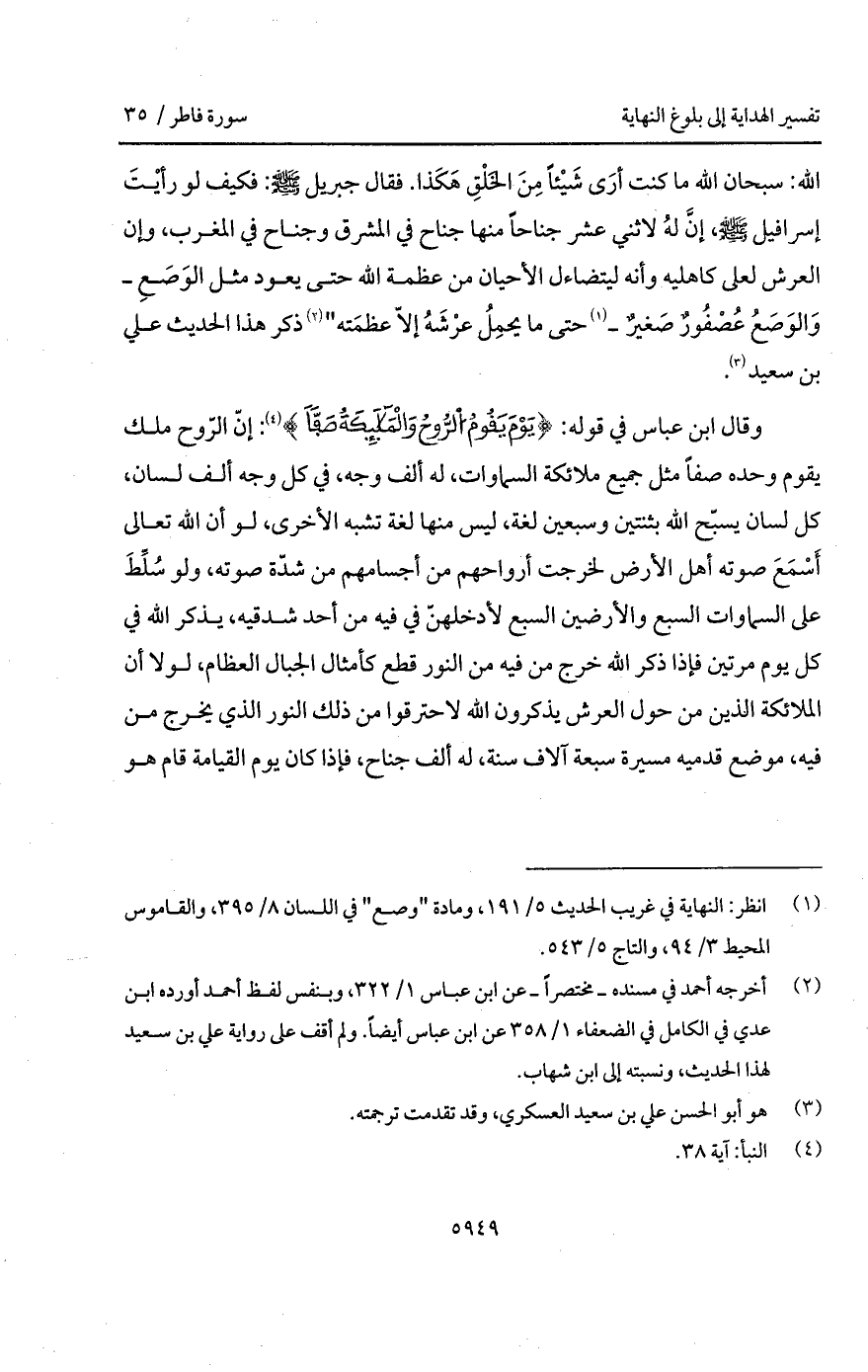 الله: سبحان الله ما كنت أرَى شَيْئاً مِنَ الخَلْقِ هَكَذا. فقال جبريل A: فكيف لو رأيْتَ إِسْرَافِيل A، إنَّ لهُ لاثني عشر جناحاً منها جناح في المشرق وجناح في المغرب، وإن العرش لعلى كاهليه وأنه ليتضاءل الأحيان من عظمة حتى يعود مثل الوَصَعِ - وَالوَصَعُ عُصْفُورٌ صَغيرٌ - حتى ما يحمِلُ عرْشَهُ إلاّ عظمَته " ذكر هذا الحديث علي بن سعيد.