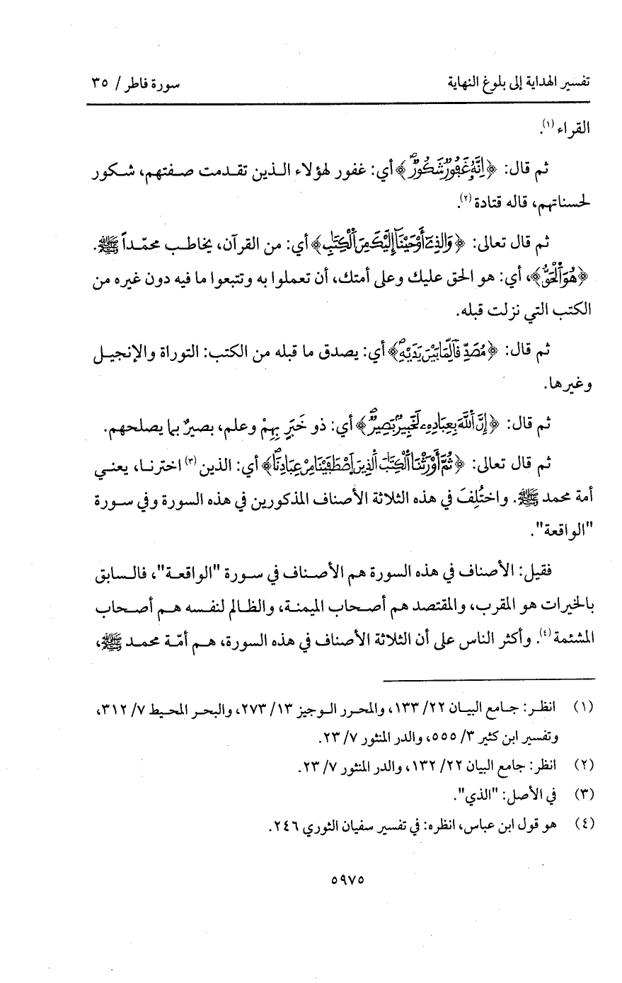 فقيل: الأصناف في هذه السورة هم الأصناف في سورة " الواقعة "، فالسابق بالخيرات هو المقرب، والمقتصد هم أصحاب الميمنة، والظالم لنفسه هم أصحاب المشئمة. وأكثر الناس على أن الثلاثة الأصناف في هذه السورة، هم أمّة محمد A،