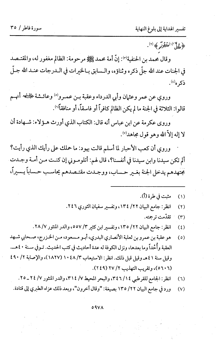وقال محمد بن الحنيفة: إنّ أمة محمد A مرحومة: الظالم مغفور له، والمقتصد في الجنات عند الله جلّ ذكره وثناؤه، والسابق بالخيرات في الدرجات عند الله جلّ ذكره.