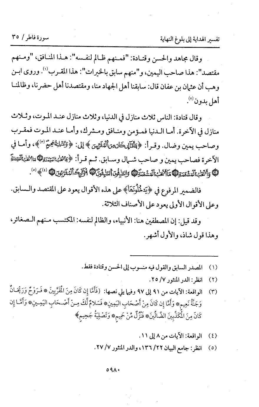 وقال مجاهد والحسن وقتادة: " فمنهم ظالم لنفسه ": هذا المنافق، " ومنهم مقتصد ": هذا صاحب اليمين، و " منهم سابق بالخيرات ": هذا المقرب. وروى ابن وهب أن عثمان بن عفان قال: سابقنا أهل الجهاد منا. ومقتصدنا أهل حاضرنا، وظالمنا أهل بدون.