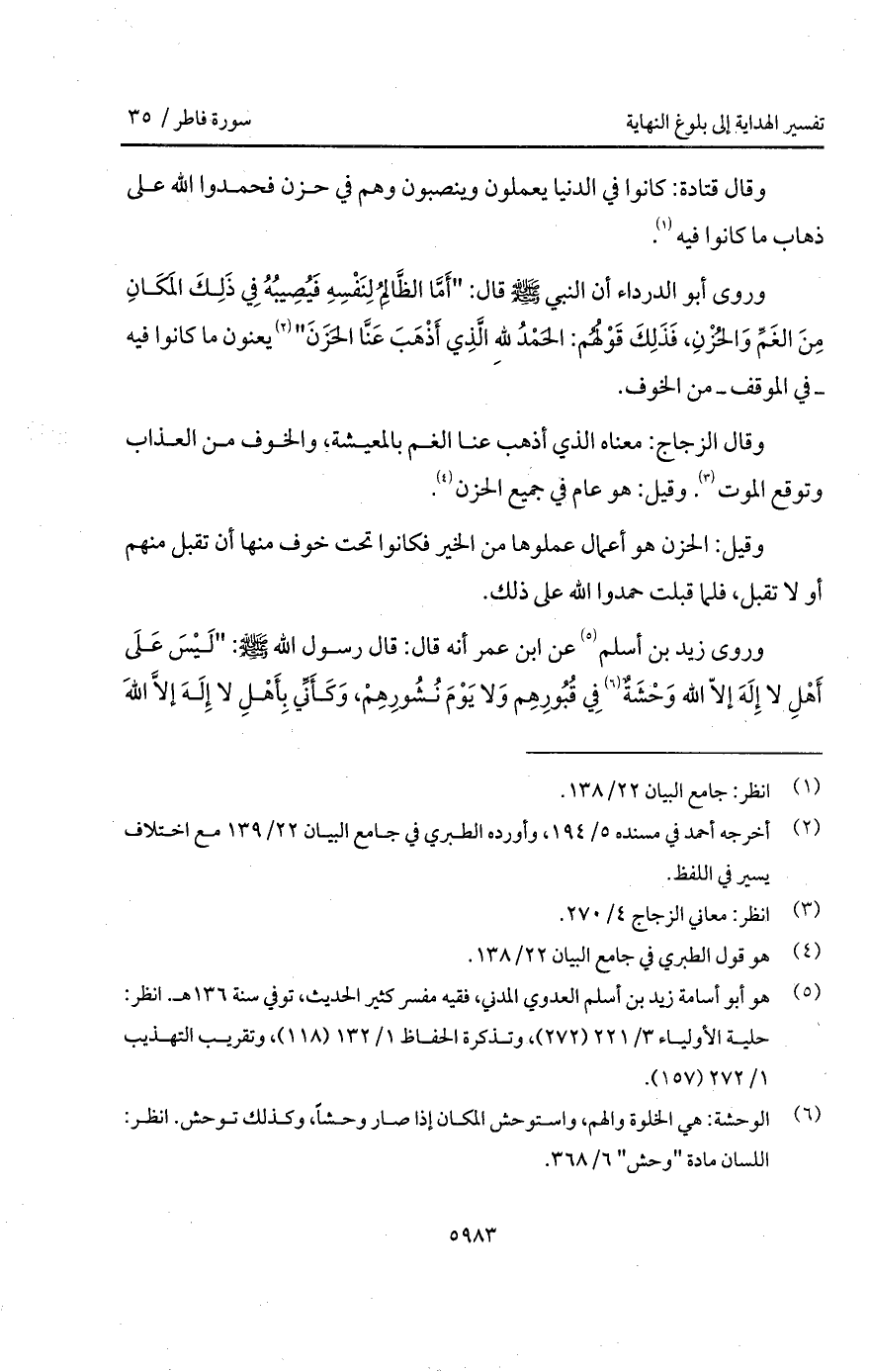 وروى أبو الدرداء أن النبي A قال: " أَمَّا الظَّالِمُ لِنَفْسِهِ فَيُصِيبُهُ فِي ذَلِكَ المَكَأنِ مِنَ الغَمِّ وَالحُزْنُ فَذَلِكَ قَوْلُهُم: الحَمْدُ للهِ الَّذِي أَذْهَبَ عَنَّا الحَزَنَ " يعنون ما كانوا فيه - في الموقف - من الخوف.