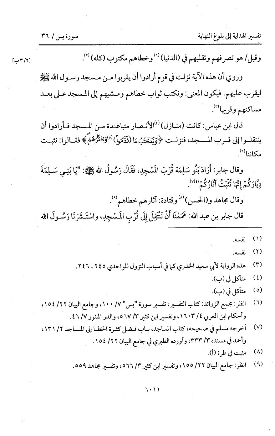قال ابن عباس: كانت (منازل) الأنصار متباعدة من المسجد فأرادوا أن ينتقلوا إلى قرب المسجد، فنزلت {وَنَكْتُبُ مَاَ (قَدَّمُواْ) وَآثَارَهُمْ} فقالوا: نثبت مكاننا.