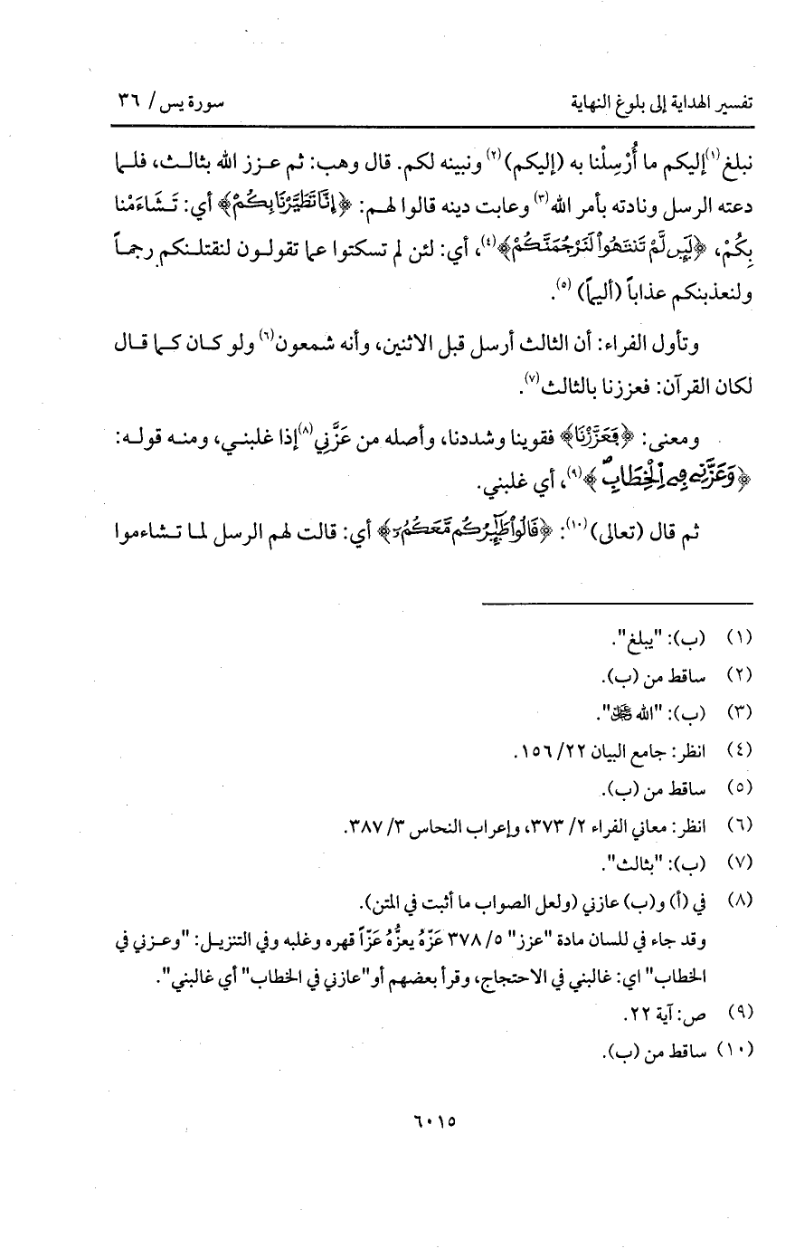 ومعنى: {فَعَزَّزْنَا} فقوينا وشددنا، وأصله من عَزَّنِي إذا غلبني، ومنه قوله: {وَعَزَّنِي فِي الخطاب} [ص: 23]، أي غلبني.