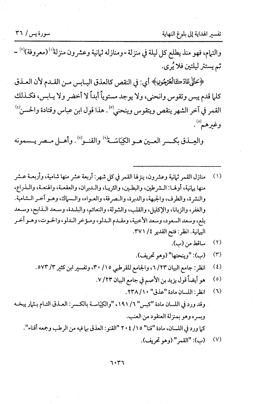 {حتى عَادَ كالعرجون} أي: في النقص كالعذق اليابس من القدم لأن العذق كلما قدم يبس وتقوس وانحنى، ولا يوجد مستوياً أبداً لا أخضر ولا يابس، فكذلك القمر في آخر الشهر ينقص ويتقوس وينحني. هذا قول ابن عباس وقتادة والحسن وغيرهم.