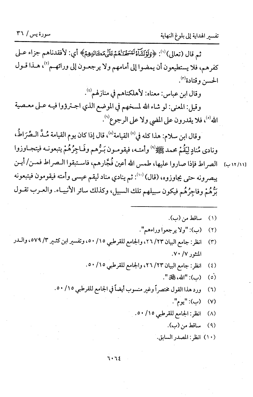 وقال ابن سلام: هذا كله في القيامة، قال إذا كان يوم القيامة مُدَّ الصِّرَاطُ، ونادى مُنادٍ لِيَقُمْ محمد A وأمته، فيقومون بَرُّهم وفَاجِرُهُمْ يتبعونه فيتجاوزوا الصراط فإذا صاروا عليها، طمس الله أعين فُجَّارهم، فاستبقوا الصراط فمن/ أين يبصرونه حتى يجاوزوه، (قال): ثم ينادي مناد ليقم عيسى وأمته فيقومون فيتبعونه بَرُّهُمْ وفاجِرُهُم فيكون سبيلهم تلك السبيل، وكذلك سائر الأنبياء. والعرب تقول