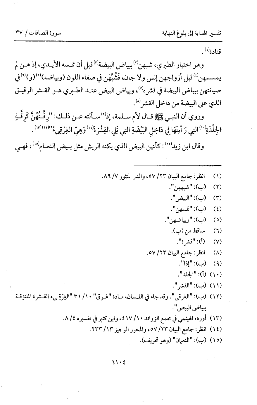 وهو اختيار الطبري، شبهن ببياض البيضة قبل أن تمسه الأيدي، إذهن لم يمسسهن قبل أزاجهن إنس ولا جان، فَشُبِّهْن في صفاء اللون (وبياضه) (و) في صيانتهن ببياض البيضة في قشره، وبياض البيض عند الطبري هو القشر الرقيق الذي على البيضة من داخل القشر.