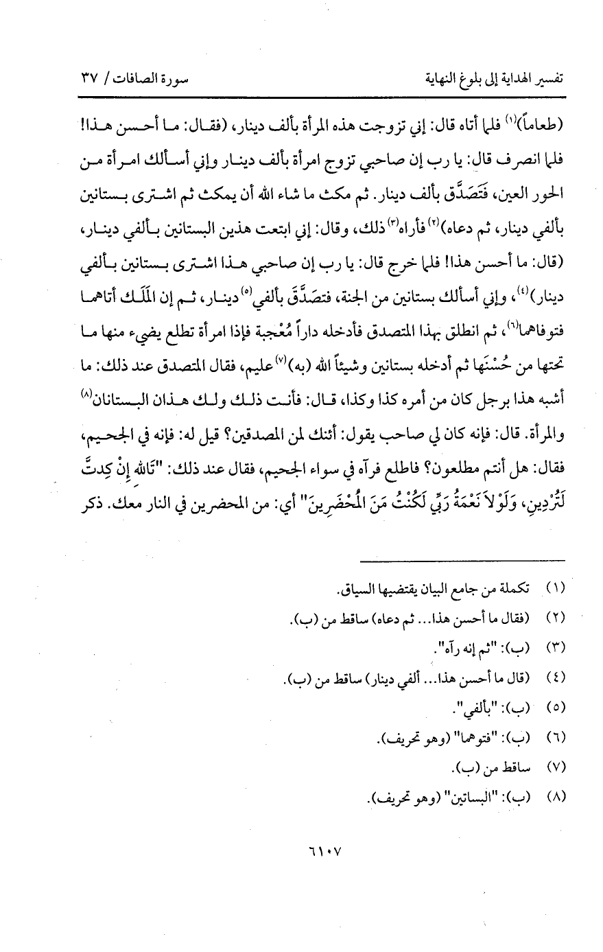 (طعاماً) فلما أتاه قال: إني تزوجت هذه المرأة بألف دينار، (فقال: ما أحسن هذا! فلما انصرف قال: يا رب إن صاحبي تزوج امرأة بألف دينار وإني أسألك امرأة من الحور العين، فَتَصَدَّق بألف دينار، ثم مكث ما شاء الله أن يمكث ثم اشترى بستانين بألفي دينار، ثم دعاه) فأراه ذلك، وقال: إني ابتعت هذين البستانين بألفي دينار، (قال: ما أحسن هذا! فقلما خرج قال: يا رب إن صاحبي هذا اشترى بستانين بألفي دينار)، وإني أسألك بستانين من الجنة، فتصَدَّقَ بألفي دينار، ثم إن المَلَك أتاهما فتوفاهما، ثم انطلق بهذا المتصدق فأدخله دار مُعْجبة فإذا امرأة تطلع يضيء منها ما تحتها من حُسْنَها ثم أدخله بستانين وشيئاً الله (به) عليم، فقال المتصدق عند ذلك: ما أشبه هذا برجل كان من أمره كذا وكذا، قال: فأنت ذلك ولك هذان البستانات والمرأة.