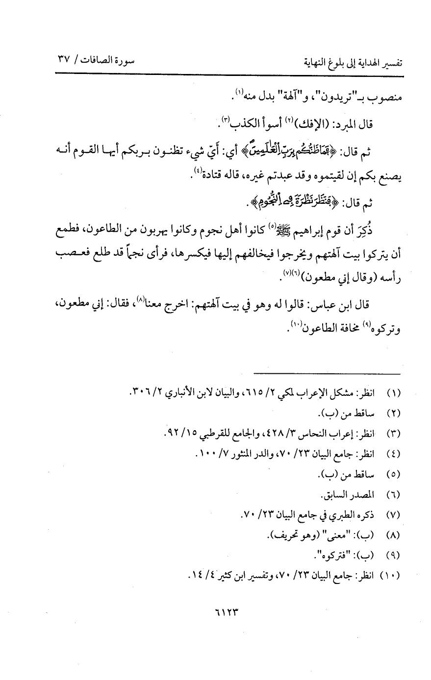 ذُكِرَ أن قوم إبراهيم A كانوا أهل نجوز وكانوا يهربون من الطاعون، فطمع أن يتركوما بيت آلهتهم ويخرجوا فيخالفهم إليها فيكسرها، فرأى نجماً قد طلع فعصب رأسه (وقال إني مطعون).