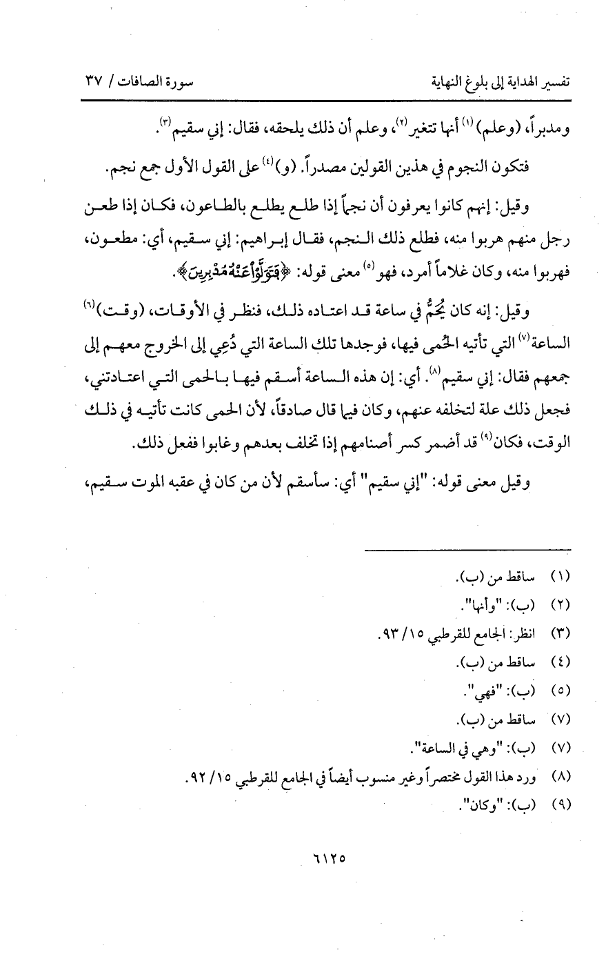 وقيل: إنه كان يُحَمُّ في ساعة قد اعتاده ذلك، فنظر في الأوقات، (وقت) الساعة التي تأتيه الحُمى فيها، فوجدها تلك الساعة التي دُعِي إلى الخروج معهم إلى جمعهم فقال: إني سقيم. أي: إن هذه الساعة أسقم فيها بالحمى التي اعتادتني، فجعل ذلك علة لتخلفه عنهم، وكان فيما قال صادقاً، لأن الحمى كانت تأتيه في ذلك الوقت، فكان قد أضمر كسر أصنامهم إذا تخلف بعدهم وغابوا ففعل ذلك.