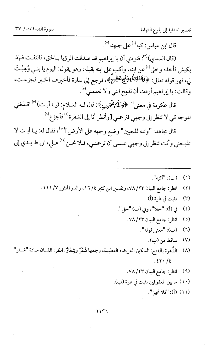 قال عكرمة في معنى {وَتَلَّهُ لِلْجَبِينِ}: قال له الغلام: (يا أبت) اقذفني للوجه كي لا تنظر إلى وجهي فترحمني [وأنظر أنا إلى الشفرة فأجزع.
