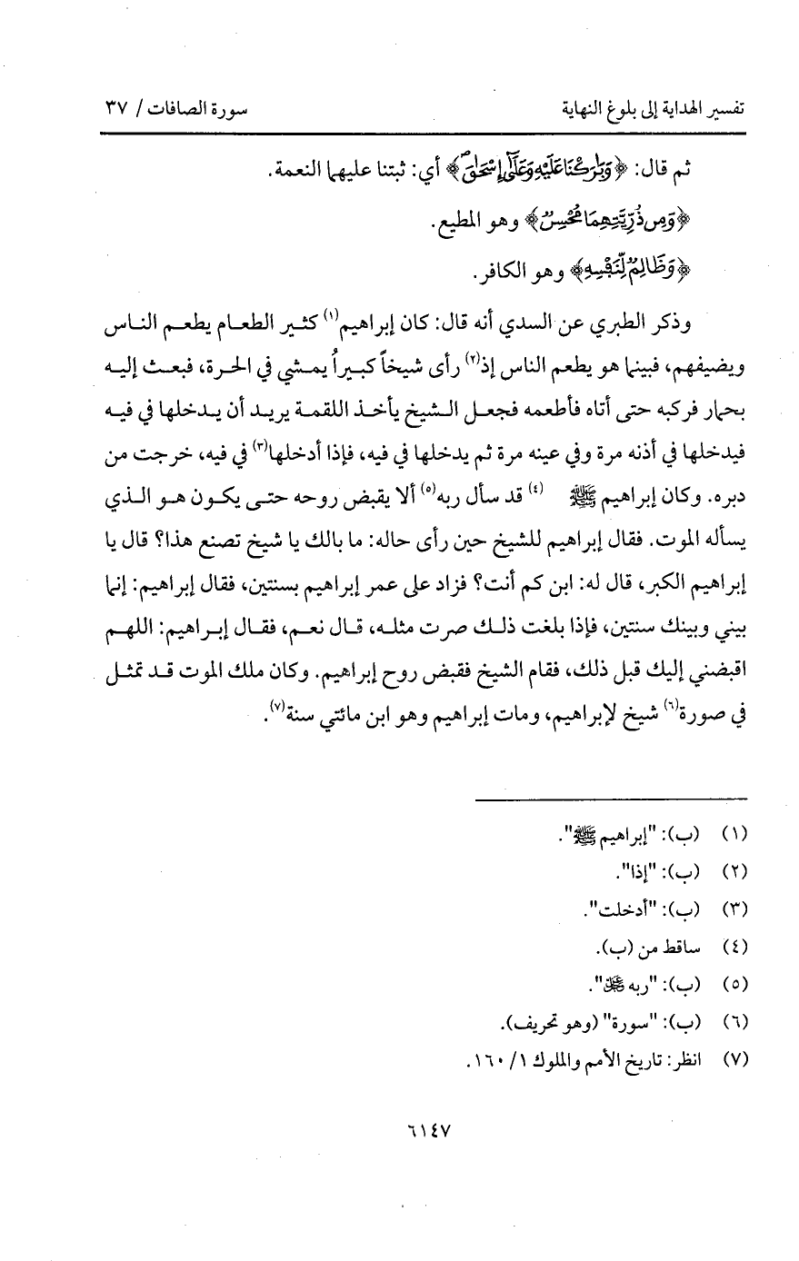 وذكر الطبري عن السدي أنه قال: كان إبراهيم كثير الطعام يطعم الناس ويضيفهم، فبينما هو يطعم الناس إذ رأى شيخاً كبيراً يمشي في الحرة، فبعث إليه بحمار فركبه حتى أتاه فأطعمه فجعل الشيخ يأخذ اللقمة يريد أن يدخلها في فيه فيدخلها في أذنه مرة وفي عينه مرة ثم يدخلها في فيه، فإذا أدخلها في فيه، خرجت من دبره. وكان إبراهيم A قد سأل ربه ألا يقبض روحه حتى يكون هو الذي يسأله الموت. فقال إبراهيم للشيخ حين رأى حاله: ما بالك يا شيخ تصنع هذا؟ قال يا إبراهيم الكبر، قال له: ابن كم أنت؟ فزاد على عمر إبراهيم بسنتين، فقال إبراهيم: إنما بيني وبينك سنتين، فإذا بلغت ذلك صرت مثله، قال نعم، فقال إبراهيم: اللهم اقبضني إليك قبل ذلك، فقالم الشيخ فقبض روح إبراهيم. وكان ملك الموت قد تمثل في صورة شيخ لإبراهيم، ومات إبراهيم وهو ابن مائتي سنة.