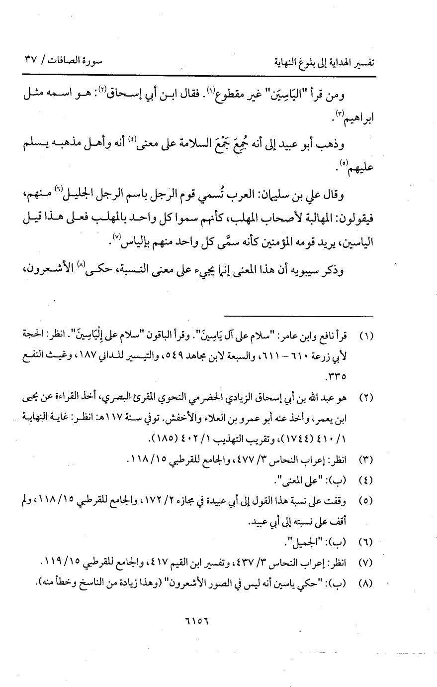 وقال علي بن سليمان: العرب تُسمي قوم الرجل باسم الرجل الجليل منهم، فيقولون: المهالبة لأصحاب المهلب، كأنهم سموا كل واحد بالمهلب فعلى هذا قيل الياسين، يريد قومه المؤمنين كأنه سمَّى كل واحد منهم بإلياس.